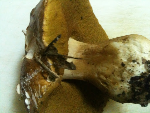 Hola, que os parece a vosotros, para mi es un boletus aereus, aunque tengo mis dudas, por su madurez.Los poros los tiene muy amarillentos y el pie es blanco con tonos marrones.Era doble y no he podido sacar ninguna foto en el campo.