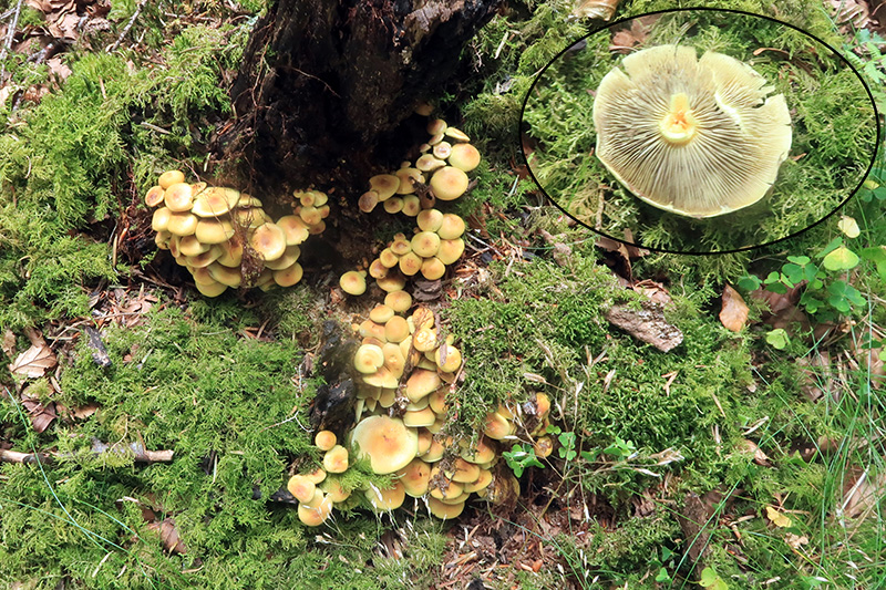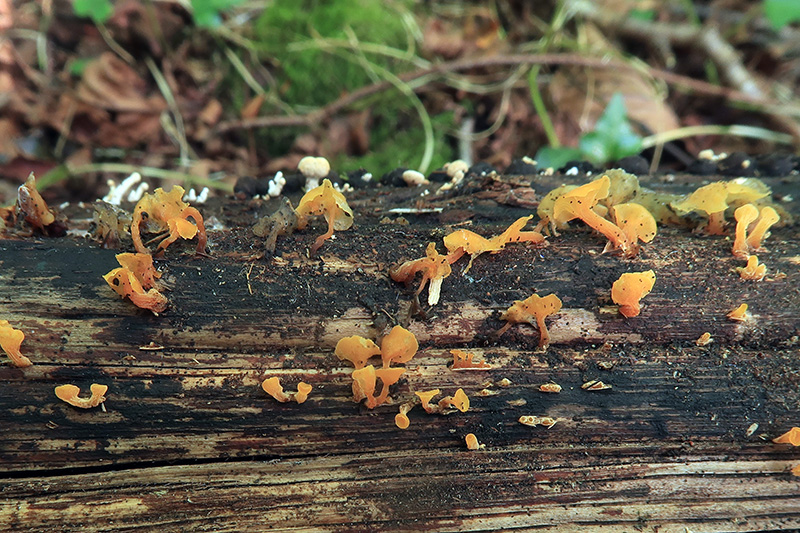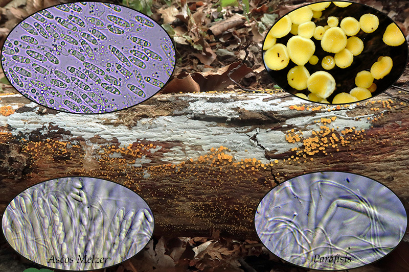 Sobre tronco de haya, brotando de manera masiva, la Bisporella citrina =