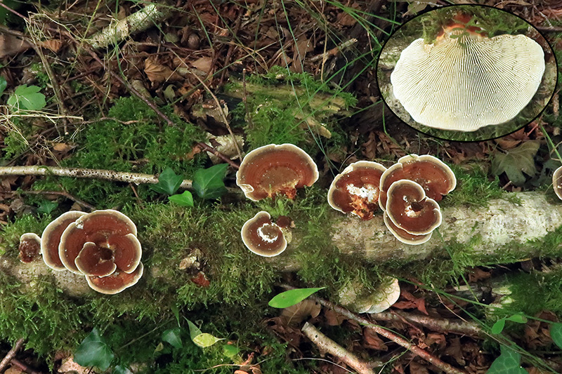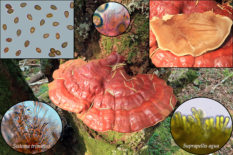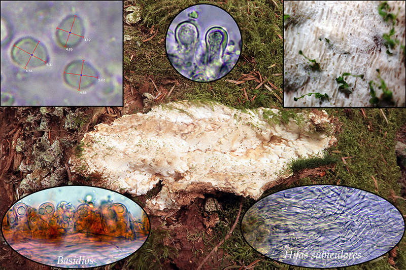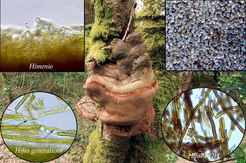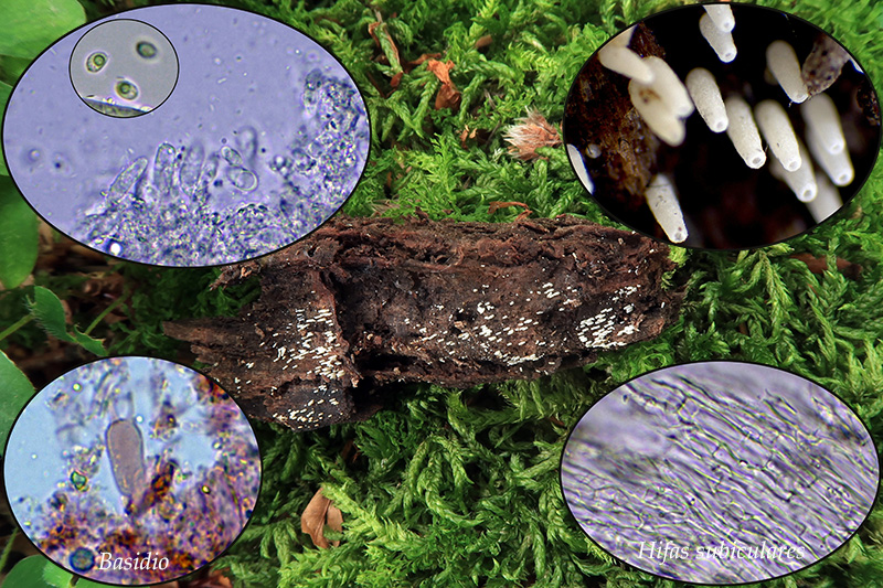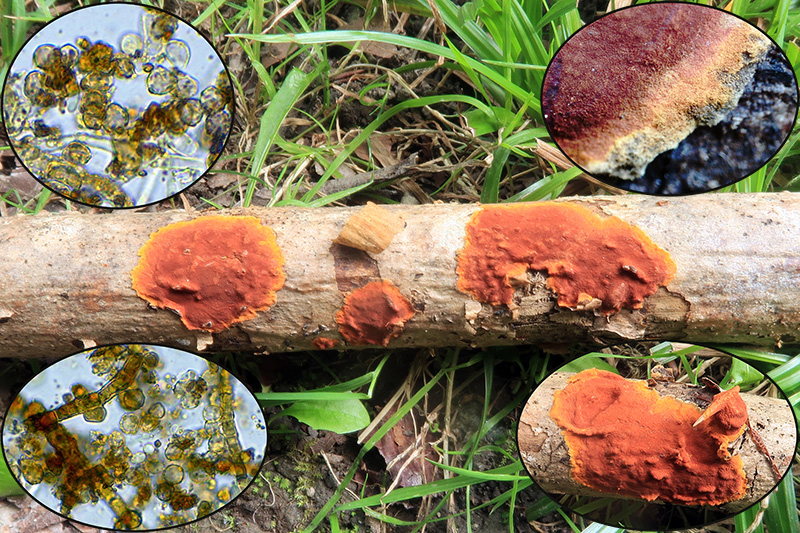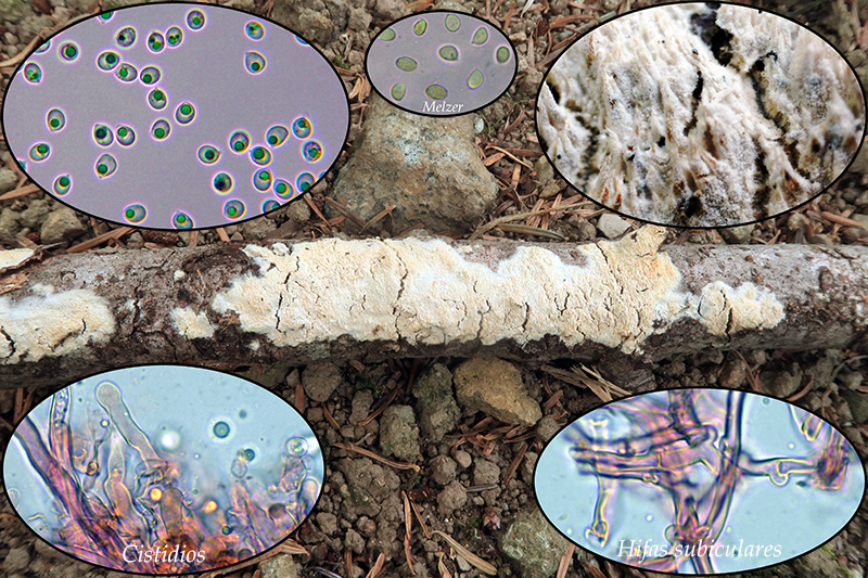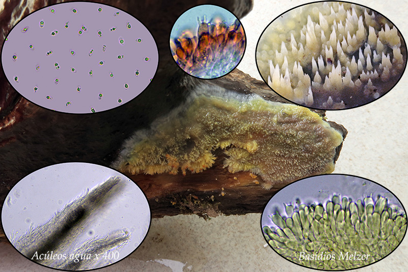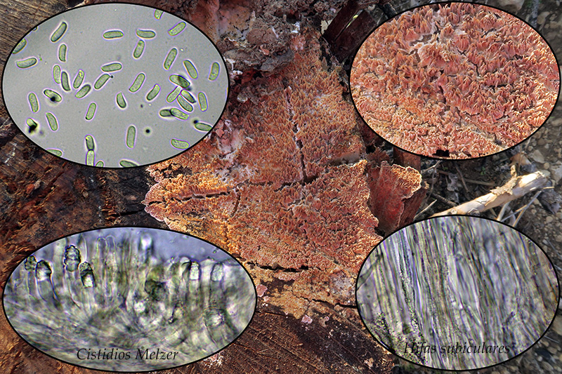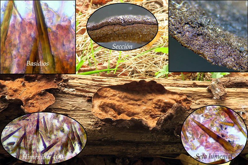 Un Hymenochaete, con el borde de crecimiento color tabaco que da origen a su nombre, aunque no pude obtener esporas, las grandes medidas de sus setas himeniales, apuntan a la Hymenochaete tabacina, actualmente denominada