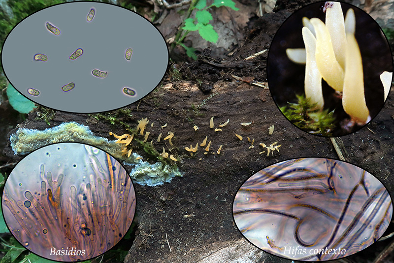 Un Corticial hydnoide brotando justo al lado de la Calocera cornea, la