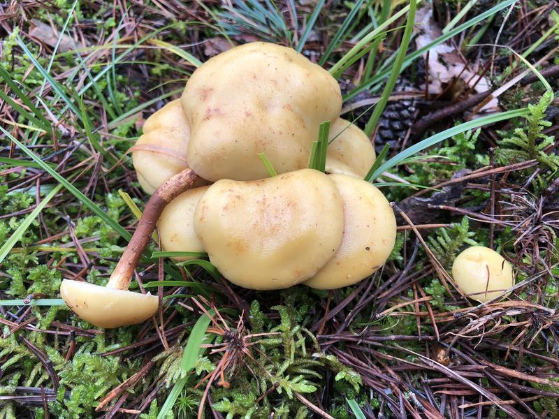 Descarto P. Pinicola porque ésta suele tener restos de velo en el sombrero y la de la foto al menos no lo observo en ninguna