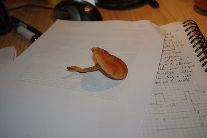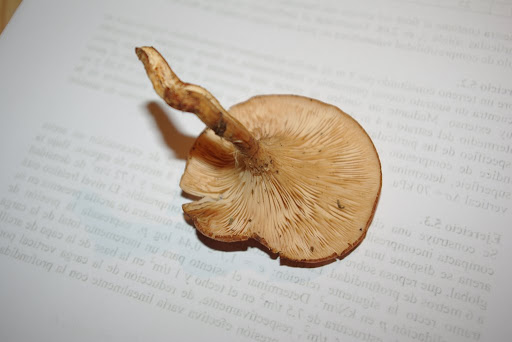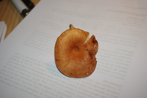 Olor fungico agradable, suave, sombrero embudado,de 2 a 6 cm, margen enrollado, color marron claro, carne muy escasa, blanca, al partir el sombrero el olor es mas intenso a fungico, himenio con laminas apretadas y decurrentes, de color marron muy claro casi blanco pie fibroso, delgado, inclinado.